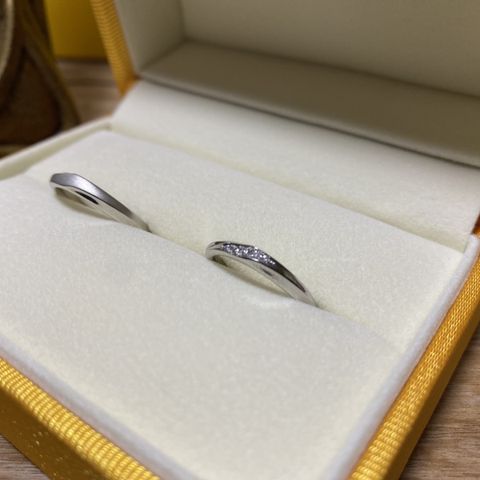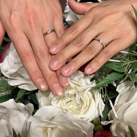シンプルながら、女性用の方にはダイヤが入っていてキラキラしており、華美過ぎない上品なキラキラさに惹かれました。リングには女性用にも男性用にも斜めのラインが入っていて、指輪を合わせると両方のラインが繋がる二人だけにわかるデザインという点も良かったです。