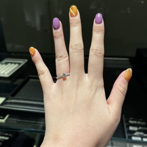 ダイヤモンドだけが付いた婚約指輪はみんなが付けてるからなと思い、少し変わったデザインを探していました。この指輪は2つのウェーブが重なって、ひとつはダイヤモンド、ひとつはシンプルなままでギラギラもしすぎず指も細く見えるのでこれがいい!となりました。直感でした。