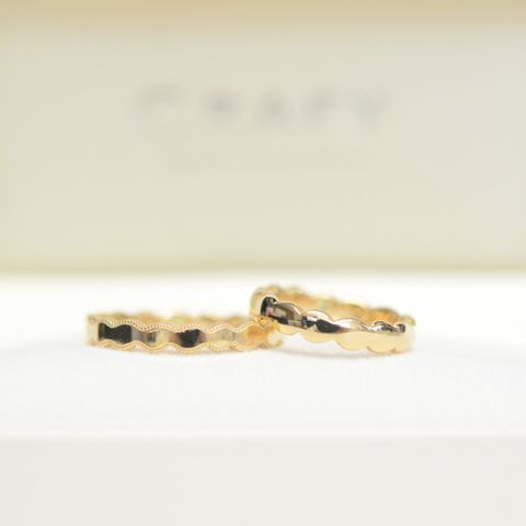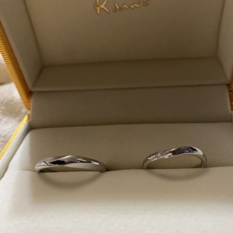 少しウェーブがかっていて結婚指輪だけでも綺麗に見えるし、婚約指輪がウェーブがかっているので合わせてもとても綺麗に見えます。 ウェーブがかっていてもとてもシンプルで、気分によって曲がっていないほうを見せることもできるのでいいです。