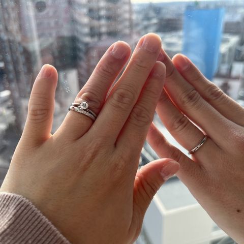 婚約指輪は、ド派手で大きなダイヤを選んで頂き、結婚指輪は、仕事中でもつけれて、おばあちゃんおじいちゃんになっても、ずっとつけとけるデザインのシンプルなもの、かたちもシンプルにストレートな愛という意味を考えストレートな形を選びました。