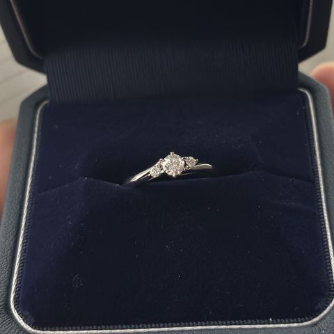 ダイヤに近づくにつれて細くなるデザインがリボンのようでとても可愛いです。つけ心地は本当にいいので試着してみてください!サクラゴールドの色味は黄色すぎず、ピンクすぎず絶妙な色合いです。ダイヤのカラーを少し下げても目立たないので、私たちはクラリティを重視しました。満足しています。