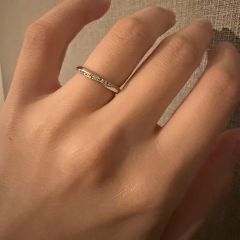 たくさん指輪を見に行った中でも、着け心地がとても良くて気に入りました。デザインはゆるくウェーブがかったものが好みで、ダイヤのさりげない存在感もあって一目惚れしました。ダイヤがリングの半分ほど入っているデザインなので、傷が目立ちにくいと思います。