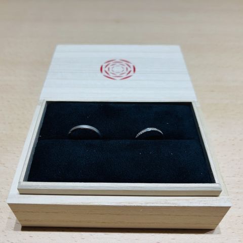 主人(アメリカ人)が、和テイストの結婚指輪を希望していた中で、tanzo に決めました。同じデザインですが、加工•カラーをそれぞれの好みで選ぶことができたので、仕上がりはそれぞれ異なるオリジナルな指輪になりました。