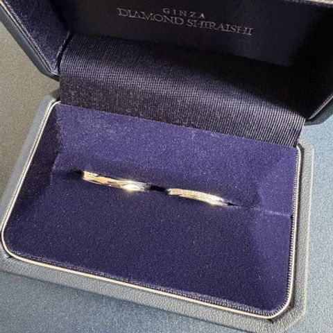 最初V字のものを探しており、新作のこちらを見せていただきました。シンプルで上品でキラキラ光輝いていてとても美しく感じ、たくさん悩みましたが、この指輪に決めて良かったです。男性用もさりげなくダイヤモンド加工してあるので、お揃い感があり良かったです。