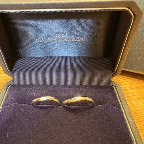 ずっとつけるつもりで、ダイヤモンドなどがついていないけれど少し意匠のあるデザインを探していました。シンプルながら真ん中が絞られたかわいくて優美なデザインです。私と夫でそれぞれ金とプラチナの色の好みが異なっていたので2色対応していて色違いお揃いにできてよかったです。