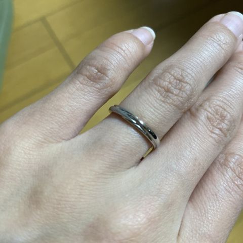 シルバーのストレートはこだわりました。 少し太くしたのでダイヤが小ぶりに見えるのが気になりましたが、担当さんに10年や20年の結婚記念にエタニティリングをプレゼントさては?と提案していただき、今では気に入っているポイントです! また、試着していく中で、着け心地が1番よかったです。 既成のものだとお互いに好みが一致するものがなく、少し予算オーバーでしたがこの指輪に決めました。