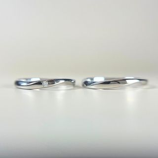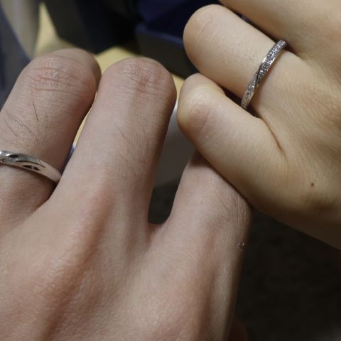 もともとはハーフエタニティより少しダイヤが少ないデザインを探していましたが、「将来たくさんハーフエタニティにすればよかった」と思う気がして最終的にはハーフエタニティに決めました。結果的に大満足しています。シンプルながらメビウスをイメージしたデザインで、男女の指輪がリンクしている点も素敵です。夫婦で別々のデザインも検討しましたが、私も夫もこのリングが気に入ったのでペアで購入しました。この指輪に出会えてよかったと思っています。本当は指の形から右上がりのデザインを探していましたが、ストレートでもメビウスのラインのおかげで、自然と右上がりに見えるところも好みでした。