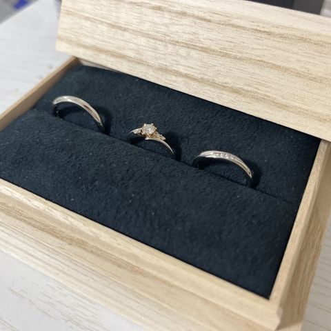 どんな結婚指輪にしても重ね付けしやすいよう、ストレートタイプに決めました 真ん中は彼が持っていたダイヤで 両サイドはツメ・埋込みのダイヤがならんでいてとってもキラキラ綺麗です!大切な日に重ね付け出来るのがとても楽しみです