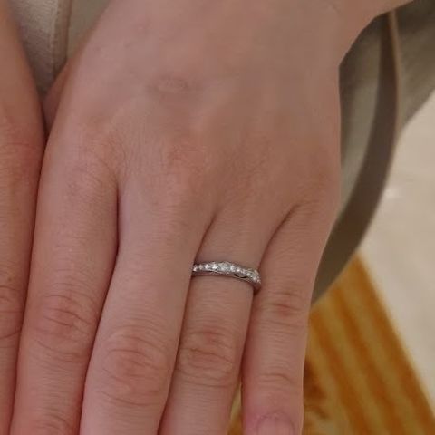 シンプルでありながら、とてもゴージャスで、とても気に入っています!私自身、ウェーブタイプが気に入り、ずっとウェーブで見ていたのですが、実際購入させていただいたリングはストレートですが、ダイヤのつき方が斜めで、どの角度から見ても綺麗にダイヤが輝き、指も綺麗に見えることがとてもお気に入りのポイントです