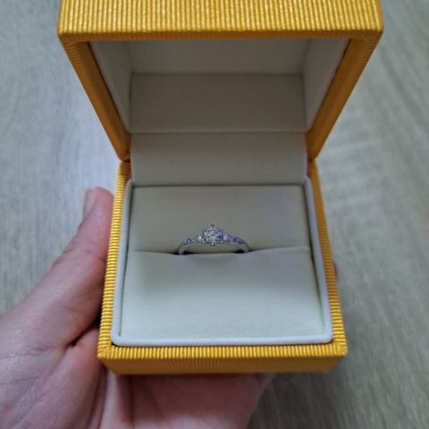 他社の婚約指輪もいくつか見ていましたが、ダイヤモンドの輝きが頭一つ抜けていたので、購入しました。ダイヤモンドにこだわりたい方は、非常におすすめです。リングについては、シンプルすぎず派手すぎないデザインが上品かつかわいくて、シーンを選ばず着用できるかと思います。