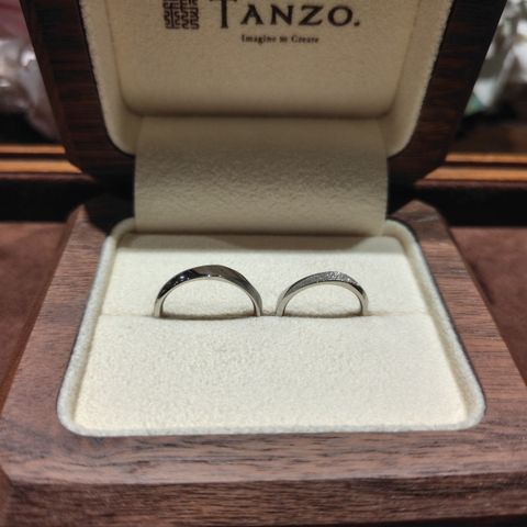 指輪は艶消し加工を行ったタイプと、ウェーブのかかったデザインにしました。指のタイプには合わないのかもしれないのですが、可愛かったのと、店員の方の後押し もあったのでこのデザインに決めました。艶消しも、入れておいたら取ることは可能とのことだったので入れました