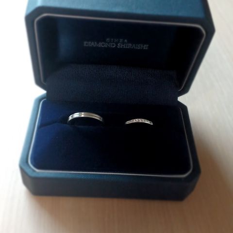 最初は同じデザインでペアの指輪を購入する予定でしたが、最終的には新郎と新婦で違うデザインの指輪を購入しました。 個性的なデザインで、少し角張ったデザインが男性の手にはぴったりだと思います。女性がつけると少し男性的な印象になる気がしました。