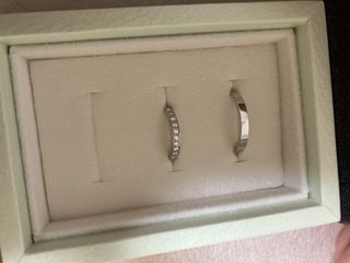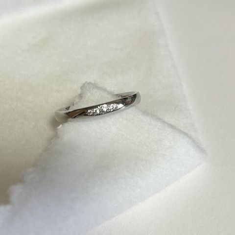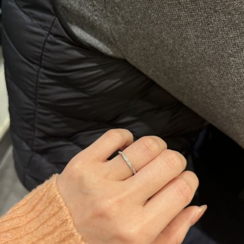 指輪の選定から購入まで彼が全て行いました。 私は様々なデザインの試着を行いました。 メレダイヤのデザインの指輪が欲しく、こちらを購入したそうです。ストレートのデザインですが、指先に向かって細くなっているため、指が綺麗に見えます。