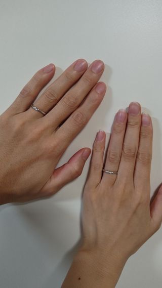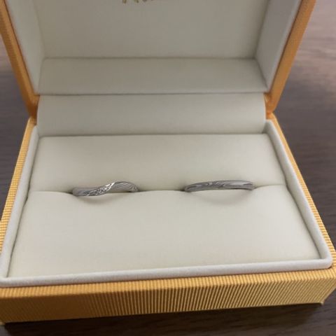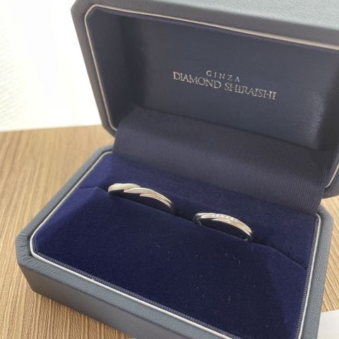 S字のデザインに夫はヘアライン、私はスターダストを入れ、 加工の境目はミル打ちで上品に、私だけ中心にダイヤをいれました。 ダイヤでギラギラしたくないけど、輝きが欲しい方にスターダスト加工がおすすめです。 また、ご婚約指輪というサイズ確認用の指輪が用意されます。 このご婚約指輪は確かプラチナ?で軽く、私の結婚指輪と重さに違いがありました。 ご婚約指輪でサイズぴったり!と思ったら、結婚指輪では重さのせいか良く動いて、特にお風呂やお皿洗など水を扱うと、抜けそうで抜けないような緩い感覚がありました。 結局サイズ直しでワンサイズ落としました。 重さによっての付け心地の違いが出ると思うのでその辺は、よく確認してみた方がいいと思います。