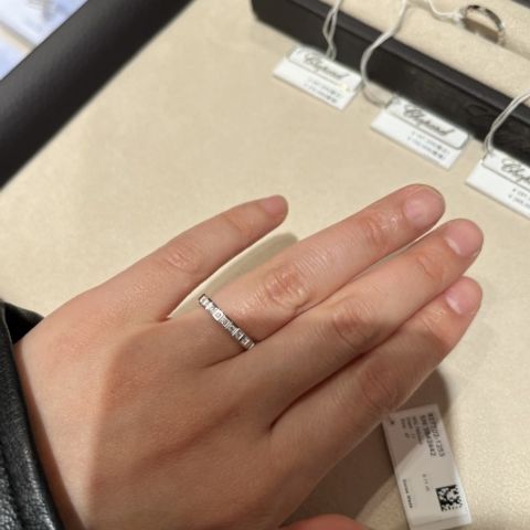 ショパールのアイスキューブ ハーフエタニティリングを購入しました。 もともとこのシリーズのミニマルでモダンなデザインに惹かれていましたが、ハーフエタニティはその上品さと実用性のバランスが絶妙で、購入の決め手となりました。 実際に手元に着けてみると、細身ながらもキューブカットが光をしっかりと反射し、控えめな中にも高級感があります。 仕事でもプライベートでも毎日身につけられるジュエリーを探している方におすすめです。