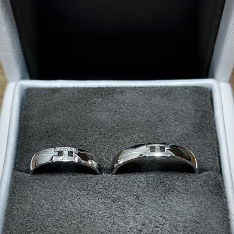 男性用はとにかくシンプルなものを、女性用も重ね付けするために少しシンプル目なものを選びました。 スリーサイドなので、上からだと少々地味ですが実際は光も入るとかなりキラキラして見えるのが良いなと思います。