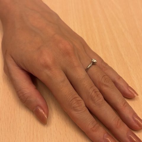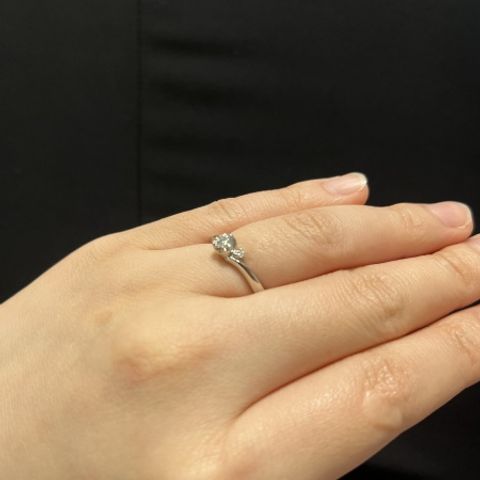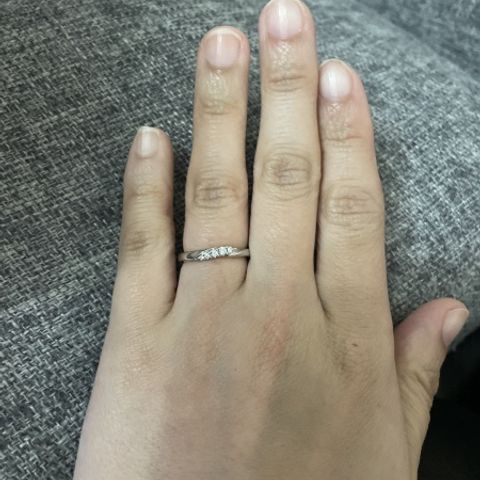 指が短く、色黒ということもあり、指が綺麗に見えるデザインを希望していた。ダイアモンドがキラキラしており、みるたびに気分が上がる。デザインも指が綺麗に見えるデザインでとても満足している。同じ悩みのある方にオススメしたい。
