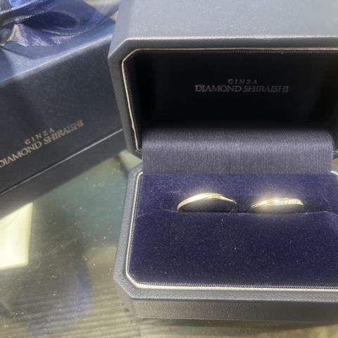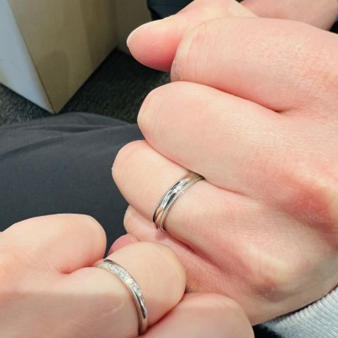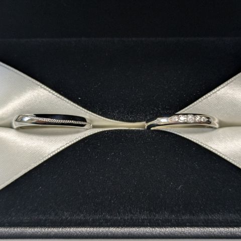 夫、ヘアラインの入ったモデルと妻、ダイヤモンドのラインで形成した指輪を作りました。打ち付けやプラチナリングの製法まで選べて、とても満足のいく出来でした。 シンプルに、自分たちらしさをオーダーメイドできる一生のパートナーをこちらでお願い出来て良かったです。