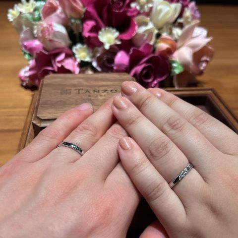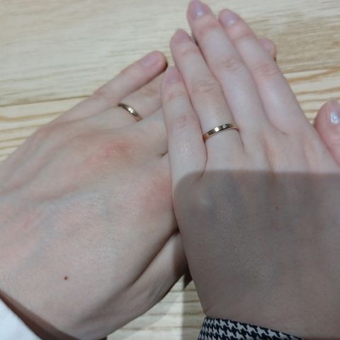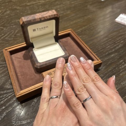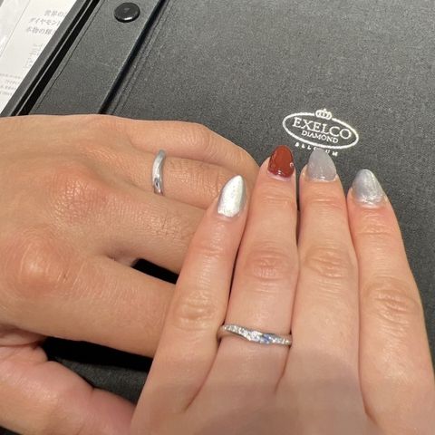 2人のそれぞれの骨格に合わせ、1番指が綺麗に見えるデザインを選びました。毎日ずっと身に着けるものだからこそ、着け心地なども重視しました。シンプルなデザインではありますが、何より着け心地が本当に気に入っています。