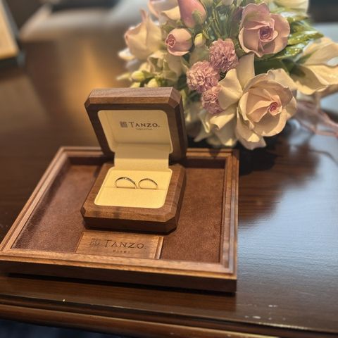 普通にプラチナで考えていましたが、TANZOオリジナルのコーラルゴールドが肌馴染みがよく、普段使いでも邪魔にならない色なので選んで良かったです。 槌目加工は指輪がさりげなくキラッと光るので、気に入っています。 男性も派手にはなりすぎないのでちょうど良い仕上がりになりました。