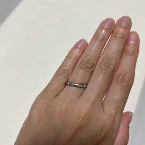 指輪自体が注文した後に1から作られてるというのが良かったです。 また指輪のダイヤモンドがほどよい感じで輝きがとても綺麗で、指の形にあっているのでとても着け心地が良かったです。彼の指輪もつや消しをして貰えたので特別感がありました。