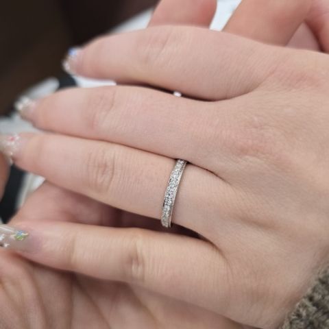 どこからみても石が見えるところが決め手です。 プラチナ素材でストレートライン。 指が綺麗に見えます。 石は15石入っていてそれがどこの角度から見ても目に入りキラキラしてるところがお気に入りです。 ミルうちハーフエタニティリングが欲しかったですが結婚指輪らしいこちらにしてよかったなと。