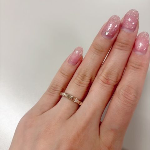 サクラゴールドの色に一目惚れだったので、他の種類も試着しました。 シンプルなデザインもいいと思ったのですが、こちらのようなカットが入っているリングは、指を動かした時にキラキラして可愛かったのでいいなと思いました。 付けていると周りの方に可愛いと褒めてもらえてとても嬉しいです。
