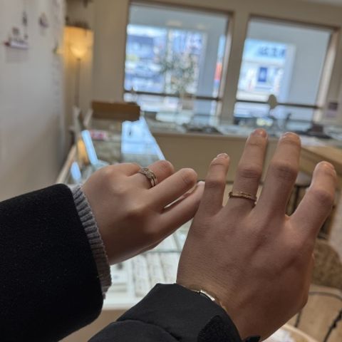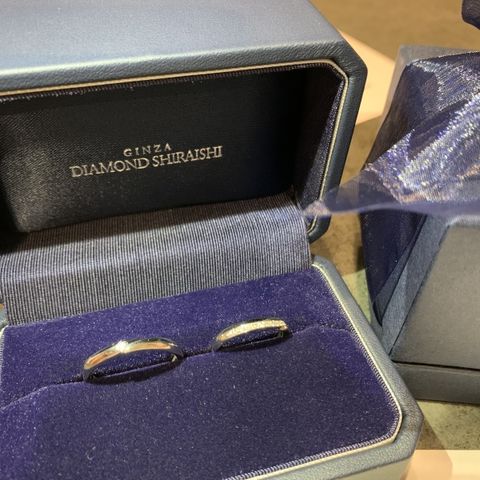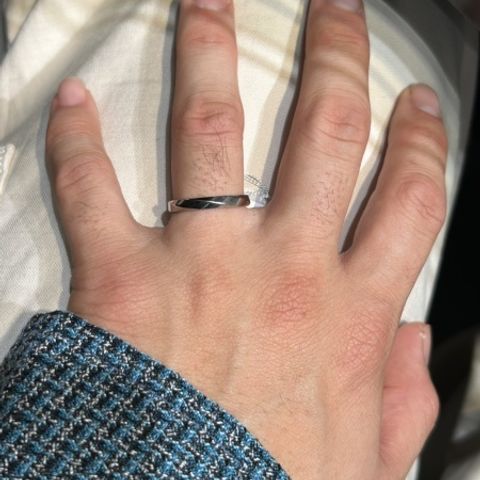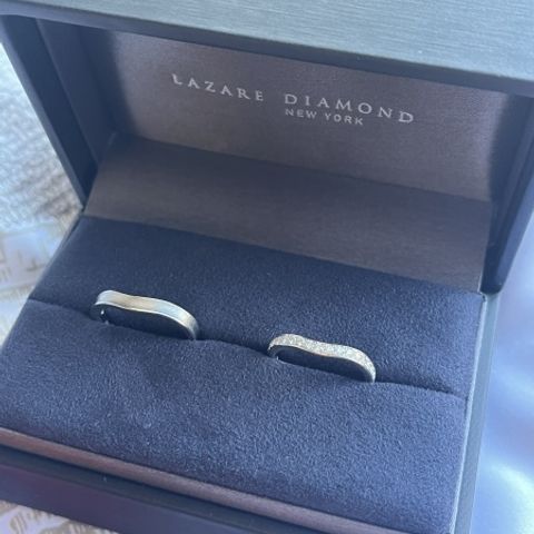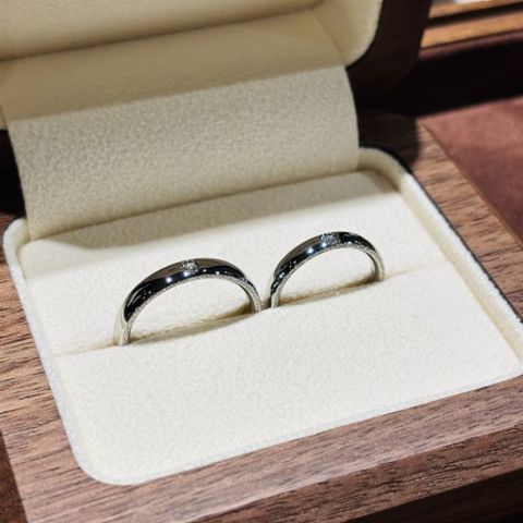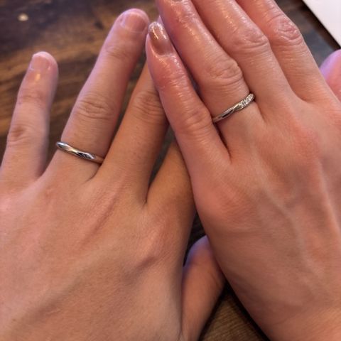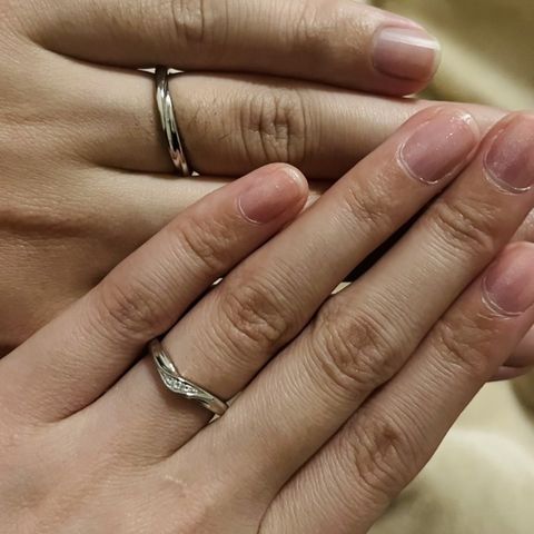 シンプルだけど、こだわりのあるデザインでとても気に入りました。 何種類か試着したのですが,自分たちの指の形に合ったリングを選べたのでよかったです。 男性側はシンプルなものばかりで、あまり違いがわからなかったのですが、今回選んだ指輪は男性の方も楽しめるデザインだと思います。