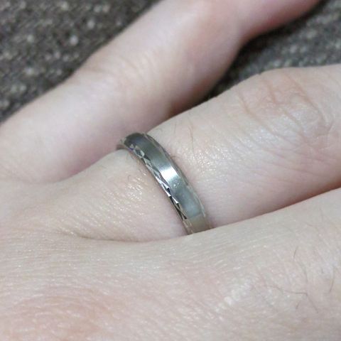 指輪のデザインはシンプル過ぎず、他の方と被らないような見た目で気に入っています。 また、とても指に馴染んでいき、フィットしています。 そして指輪の両端がキラキラするカット加工があり、動きがあると光りとてもきれいです。