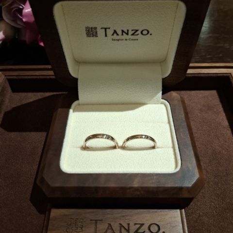 Tiffanyにしか出せないピンクゴールドの色が素敵です。 妻の方の指輪は少し特徴的で凹凸があり、ダイヤも全周に埋め込まれていて指輪が回っても常にキラキラした状態です。 夫の方はシンプルなデザインで、長く使えるものを選びました。