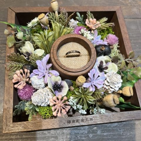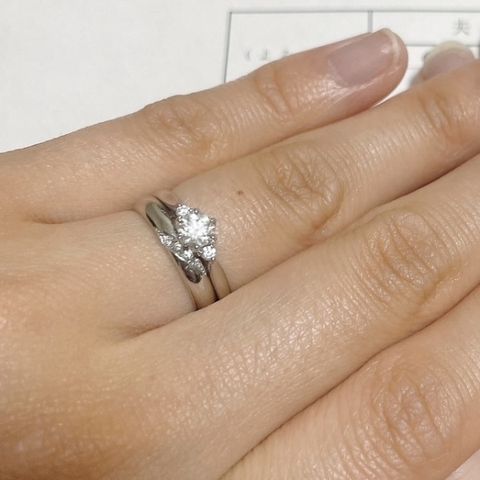 結婚指輪と重ね付けできるようなデザインにしました。 横から見るとツメの部分がブーケになっていて、お気に入りのポイントです。 メインダイヤの両サイドにもダイヤがあり、両サイドのダイヤもひとつひとつしっかりとダイヤの輝きをしていて、とても綺麗なデザインです。
