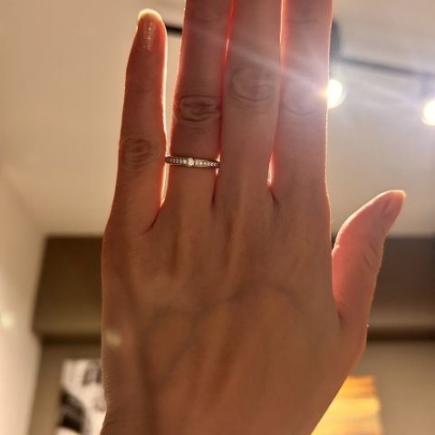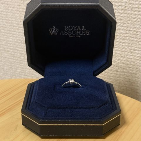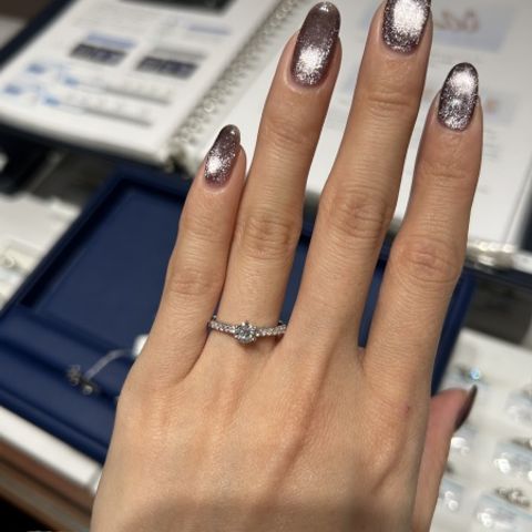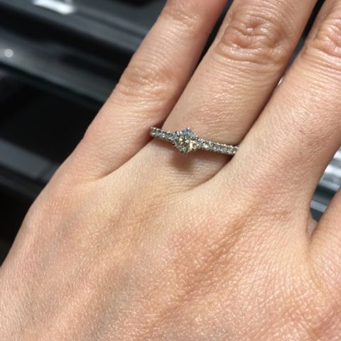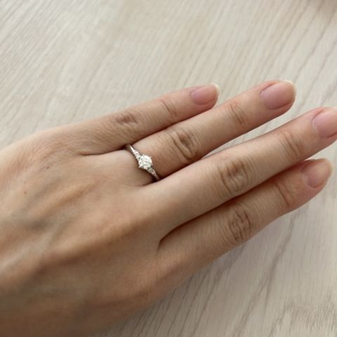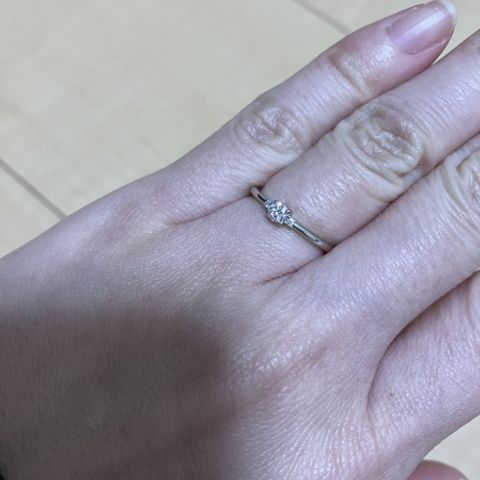 品があってかわいい!!! ダイヤはお相手がセレクトしてくださいました。台座は一緒に選びに行きましたが、360度光が入ってダイヤが煌くものに決めました。華奢で主張しすぎずダイヤの魅力を最大限引き出してくれるデザインがお気に入りです。