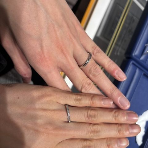 男性の指輪の中でもあまりないデザインを探していた中かっこいいデザインで即決まりました。 女性の指輪は側面にもダイヤモンドがついていてどの角度から見てもダイヤモンドが見えるのがゴージャスで綺麗だったので決めました!