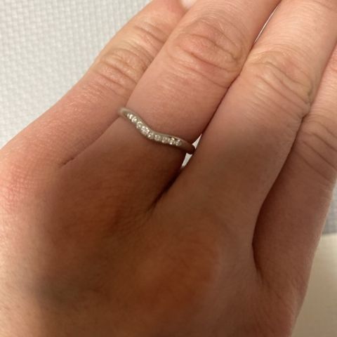 デザインはシンプルだけど、カーブがかったデザインで指が細く長く見える仕様。シンプルなのでどのコーディネートにも合うのがポイントです。婚約指輪との重ね付けも流行ってますが、婚約指輪はつけないと決めていたので、あえて重ね付けしないデザインを選びました!