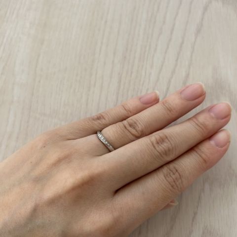 初めはシンプルなデザインも考えていましたが、歳を重ねても飽きがこず、何よりもダイヤモンドがキラキラっと光って見るたびに嬉しくなるような指輪を結婚指輪に選びました。 指輪の半分くらいにダイヤモンドが並んでるので、少し回っても気にならないところも気に入ってます!