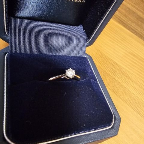 憧れのブルーボックス。憧れのTiffany。初めは婚約指輪は普段から使えないものだから、勿体無く感じていました。ただ、一生に一度ならあってもいいのではないかとのことで頂けることになりました。一粒ダイヤだと婚約指輪感が強く、普段使いしにくそうと思っていたところ、こちらの指輪を提案していただきました。キラキラしていてとってもかわいいです。お休みの日に必ずつけてお出掛けしたくなるデザインと付け心地です。 指の間の隙間があるのと、普段から薬指にペアリングをつけていたので付け心地は気にならないです。薬指の隣り合う指が近いとぶつかって気になるかもしれません。