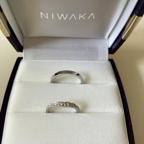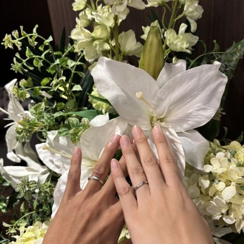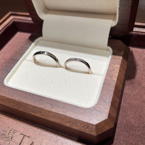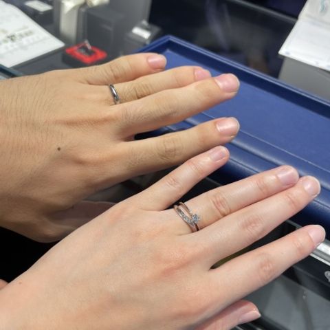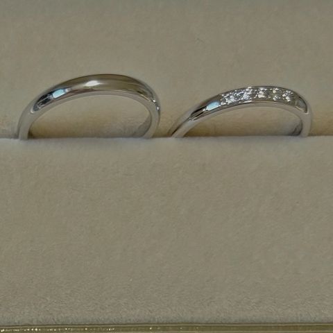 婚約指輪を先に選んでいたので、それに合うものを探していました。 ブランドは違いますが、合わせて作ったかのように綺麗に重なったところがよかったのでこの指輪を選びました。 男性側の指輪はシンプルですが、少しカーブがかかっているのと、ラインが入ってシンプルすぎないところが気に入っています。 女性側の指輪は見える位置にダイヤが散りばめられていて、とても綺麗で気に入っています。