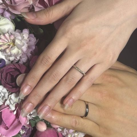 シンプルで、「結婚指輪をしている」以外の印象を与えないような結婚指輪を探していました。男性のリング幅が2.2mm、女性のリング幅を2.0mmにすることで、それぞれの指に合ったリングになりました。女性のリングには小粒のダイヤモンドを一点埋め込みました。とても綺麗に仕上げていただき満足しています。