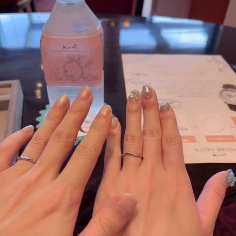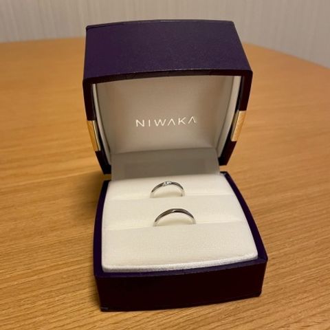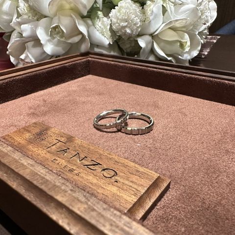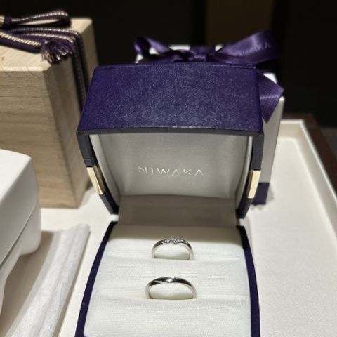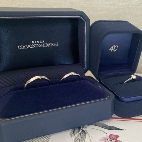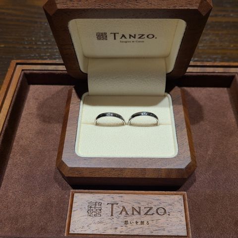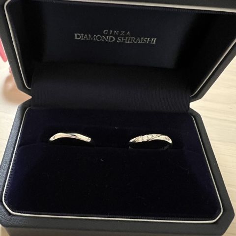 元々は2人で同じデザインの指輪で、お揃い感を出したいと要望を出していましたが、結果的に、それぞれが気に入ったデザインが異なったため、別のデザインにしました。しかしお揃いに見える2つ(唐花と初桜)です。唐花は、シンプルでありつつもキラキラしていてかわいいです。初桜は、太さを選べますし、彼の指に非常にあっていて、すごく気に入っています。