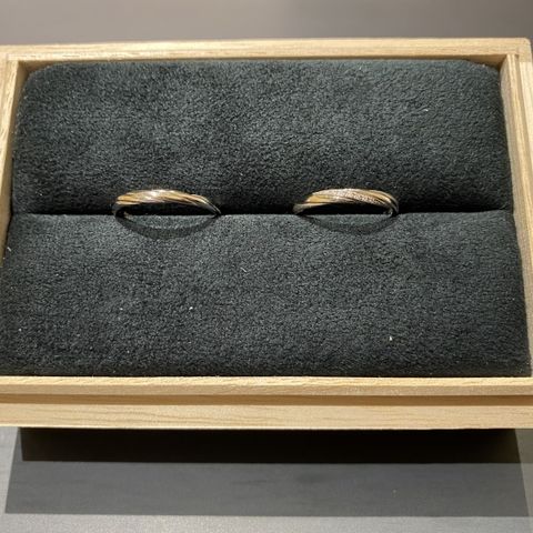 色々な種類の指輪を試着させていただき、少し捻れているデザインが手が綺麗にみえ気に入りました。お互いの種類は違うものですが形が同じかたちなので合わせてもおかしくないですよっと定員さんが後押ししてくれお互い好きなデザインの指輪を選ぶことができました。色味なども数色ありました。