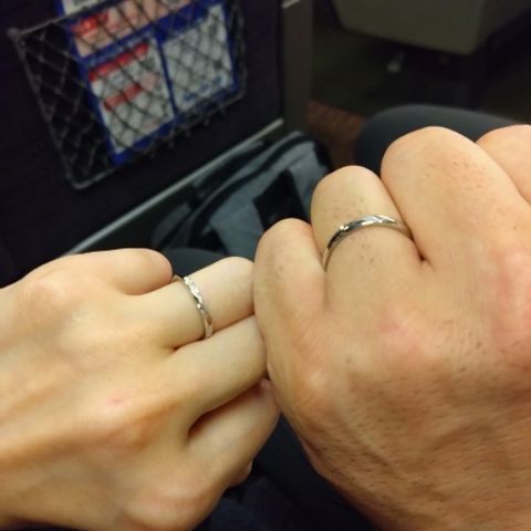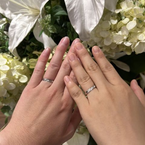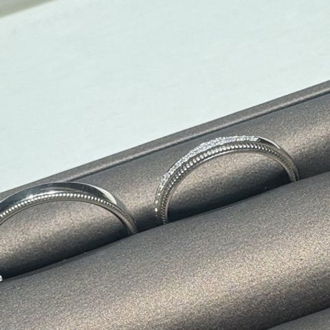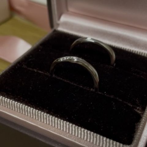 あまりない、側面にダイヤが入ってるデザイン。 メンズはプラチナ素材、レディースはグレーゴールド(ブラックゴールド)で作成。 プラチナと並べても、グレーゴールドの色味は全然気にならず、すぐにこれだ…!と運命を感じました。 金属アレルギーだったのですが、自分の陽性だったアレルギー素材をお伝えし入ってないことを確認して制作に入ってくださったのが安心材料になりました。