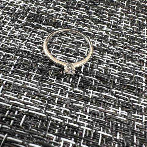 左右アシンメトリーのデザインで、見る人によって印象が変わるところがお気に入りです。 左側は彫り留めで上品にダイヤモンドが輝く一方、右側は爪留めでたくさんの光が入りキラキラと輝きます。 リング自体も細すぎず若干ウェーブがかっているので、指が綺麗に見えます。