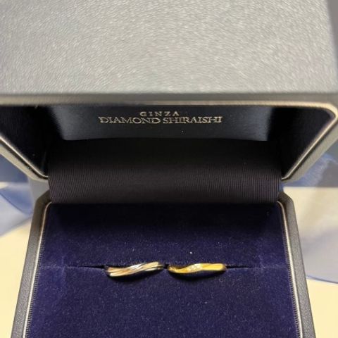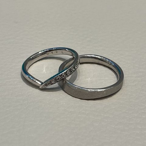 男性側はシンプルで、ウェーブのあるデザインに、一部艶消し加工を施していただきました。 女性側は同じくウェーブのあるデザインでダイヤモンドが入っています。 裏側には、シークレットストーンを埋め込み、イニシャルと日付を彫っていただきました。