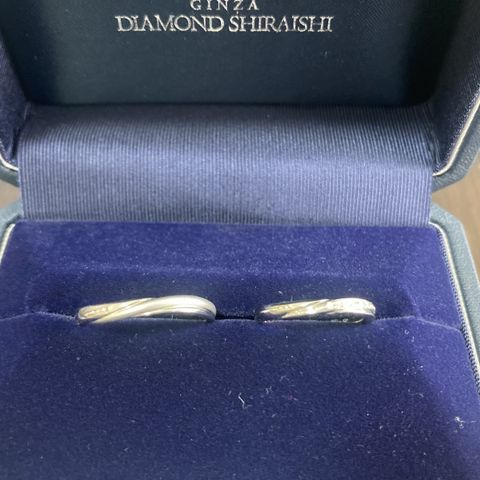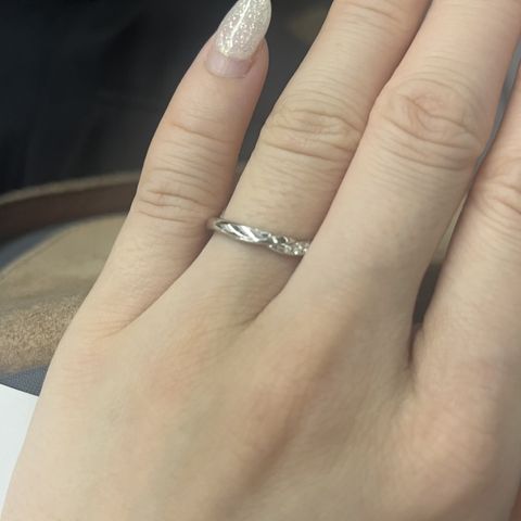ウェーブタイプの指に合うねじりのあるデザイン、職場でも浮かない華美すぎずさりげないダイヤがポイントです!指輪の裏にもイニシャルや、結婚記念日を刻印していただきました!リングの太さも自分の指の形に合うサイズです!