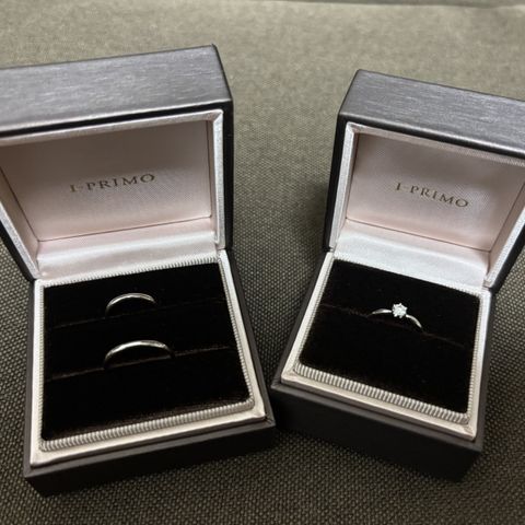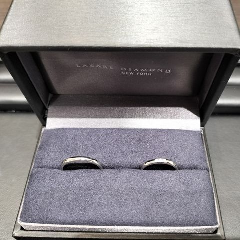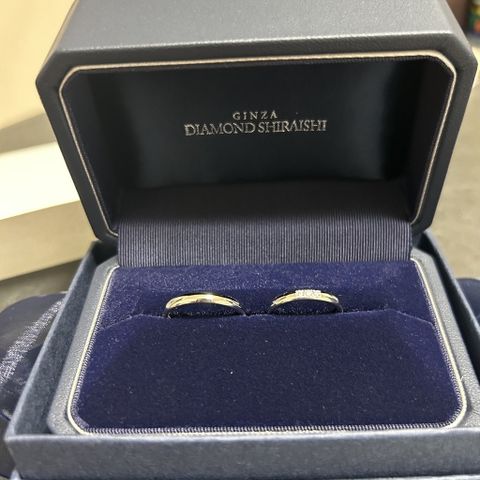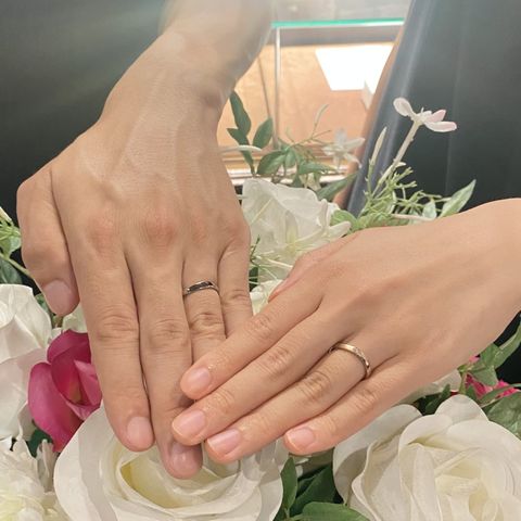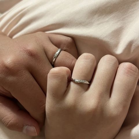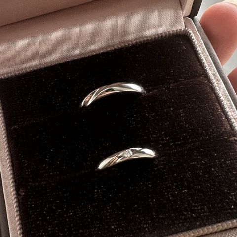 女性用リングは斜めにダイヤが入ってるので指が細く見える。且つさりげなくダイヤが輝くのでふとした時にワクワクする! 男性用はマット加工がとても素敵で他には無いデザインだと思う。裏にも刻印やストーンが入れられて、それも自由に考えられるのが楽しい!
