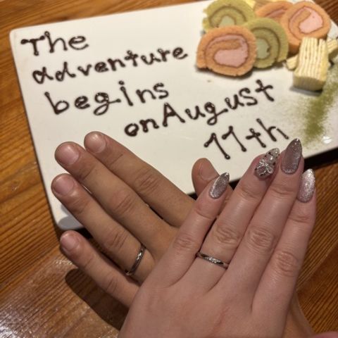 男性はシンプルなデザインで、女性はシンプルすぎず3石のダイヤが入っているので華やかなデザインを選びました。デザインも豊富に選ぶことができ、シンプルなデザインでも鍛造製法で作られた素材のため重厚感のある指輪に仕上がっています。