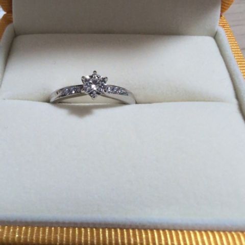 シンプルで流行り廃りのないデザインが良いと考え、こちらに決めました。ダイヤモンドの大きさが小さ過ぎず大き過ぎずどのような場面でも使いやすいと思います。指輪の方が石の方に向かって細くなっているため指が細く見えます。