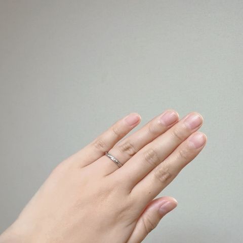 デザインがシンプルすぎず派手すぎず、キラキラが欲しいけどゴテゴテは嫌という想いにぴったりのリングでした。 歳をとっても長くつけていられそうなところも素敵なポイントでした。 付け心地も違和感なくフィットしています。