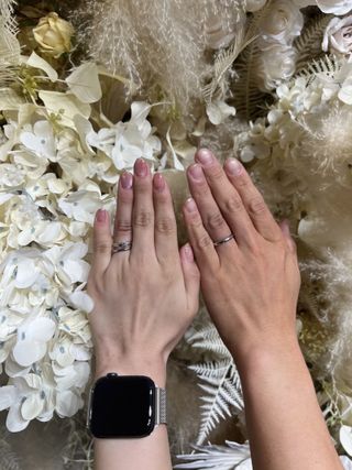mina.jewelryさんの指輪は、地金の色や形状を自分好みにセミオーダーできるので、夫婦でお気に入りの結婚指輪を作ることができました。シャンパンゴールドの色味は、肌に馴染んで私服にも合わせやすく、毎日つけてても飽きがこないです。他のブランドではあまり見かけないような、シンプルだけど遊び心のあるデザインも気に入っています。