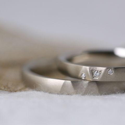 シンプルな指輪を制作していただきました。シルバー色で飾りなどはありませんが、ただの輪っかではなく、一部が尖ったデザインです。何もないように見えて一工夫してあるところが、とても気に入っています。婚約指輪は、結婚指輪に似たデザインで、重ね付けするととても素敵です。